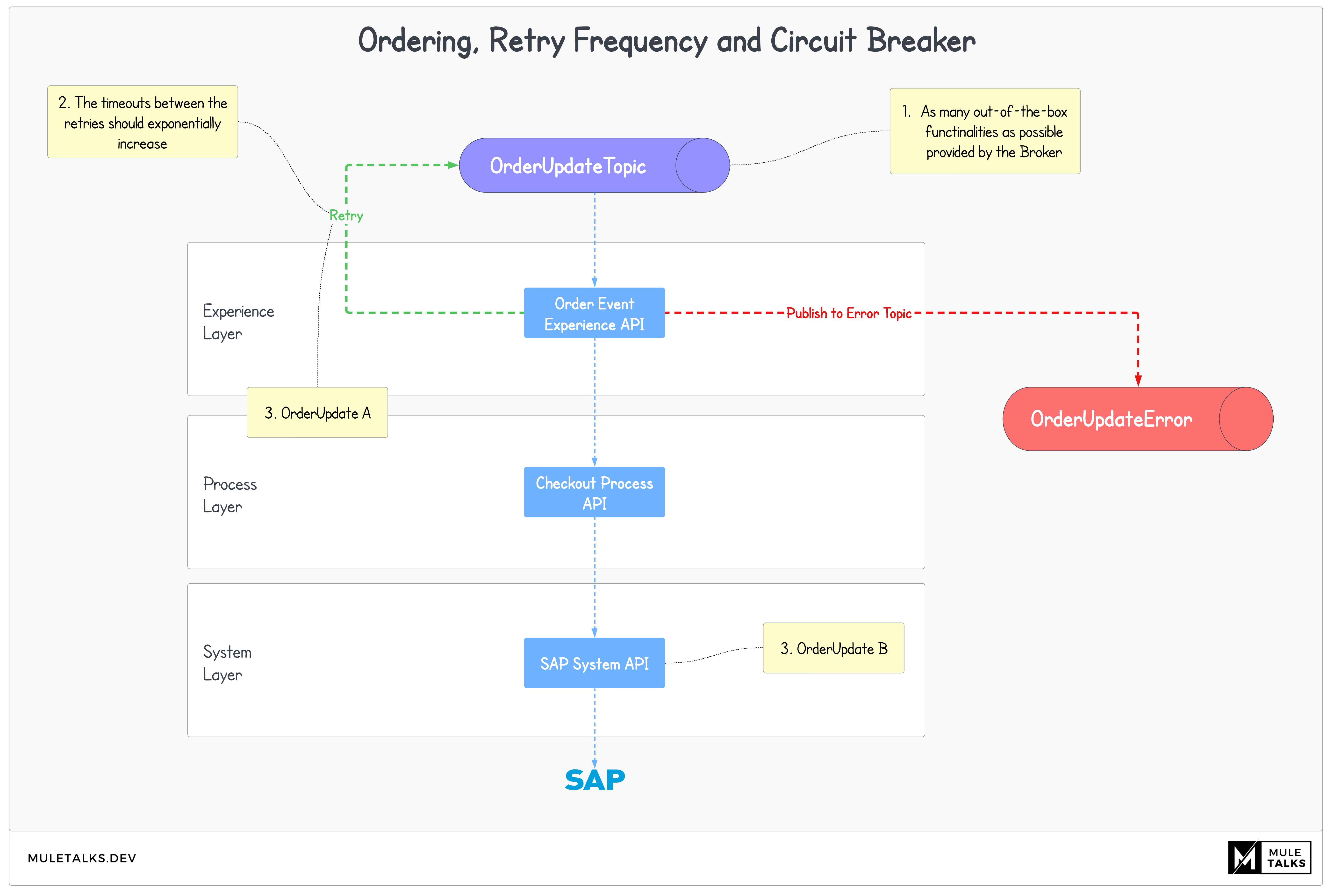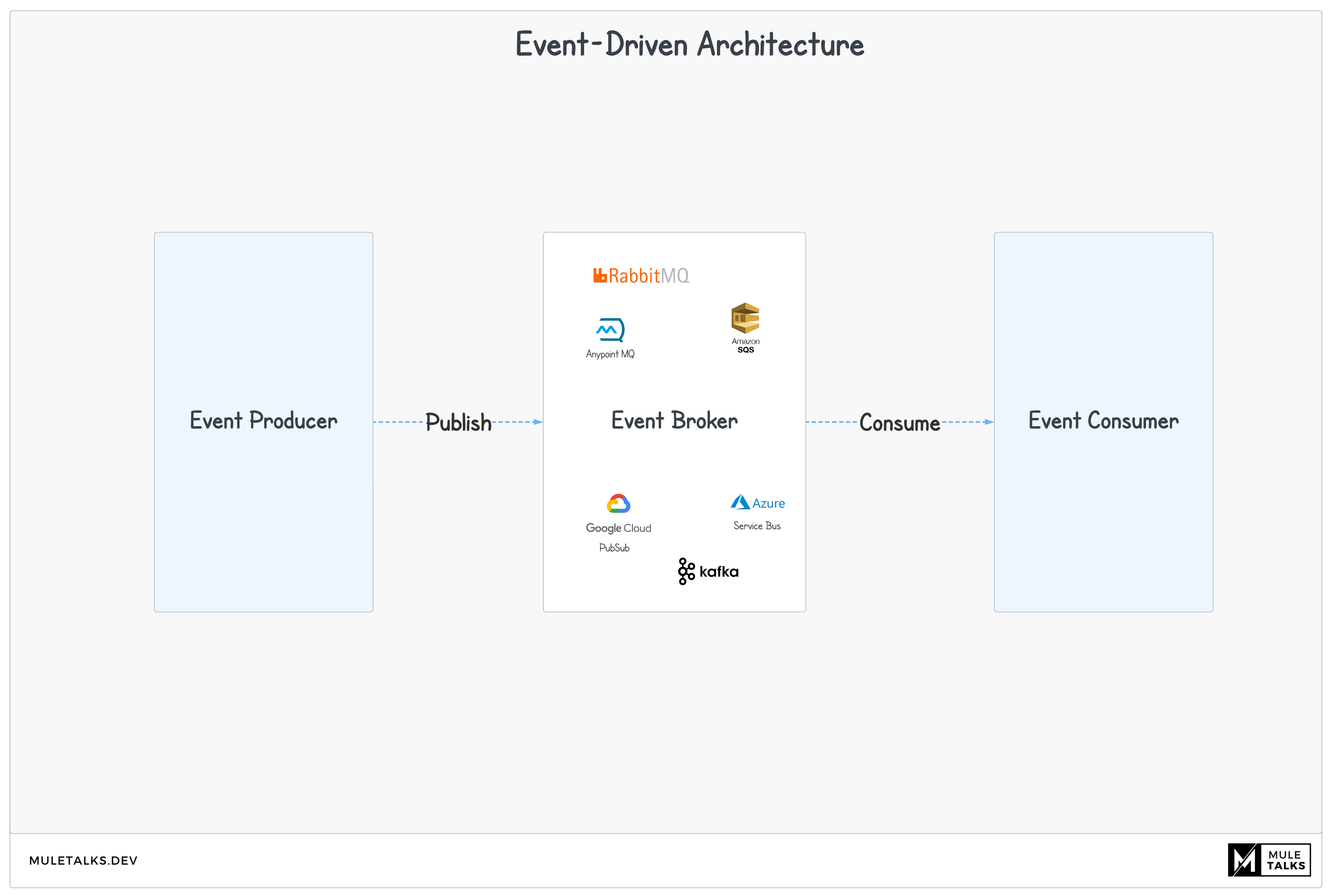 Always OOTB first: We always strive to utilize out-of-the-box (OOTB) functionalities from the Event Brokers such as Kafka, Google PubSub, AWS SQS, Azure Service Bus or Rabbit MQ as much as possible. This approach minimizes custom implementations in MuleSoft, ensuring a lean and maintainable integration layer.