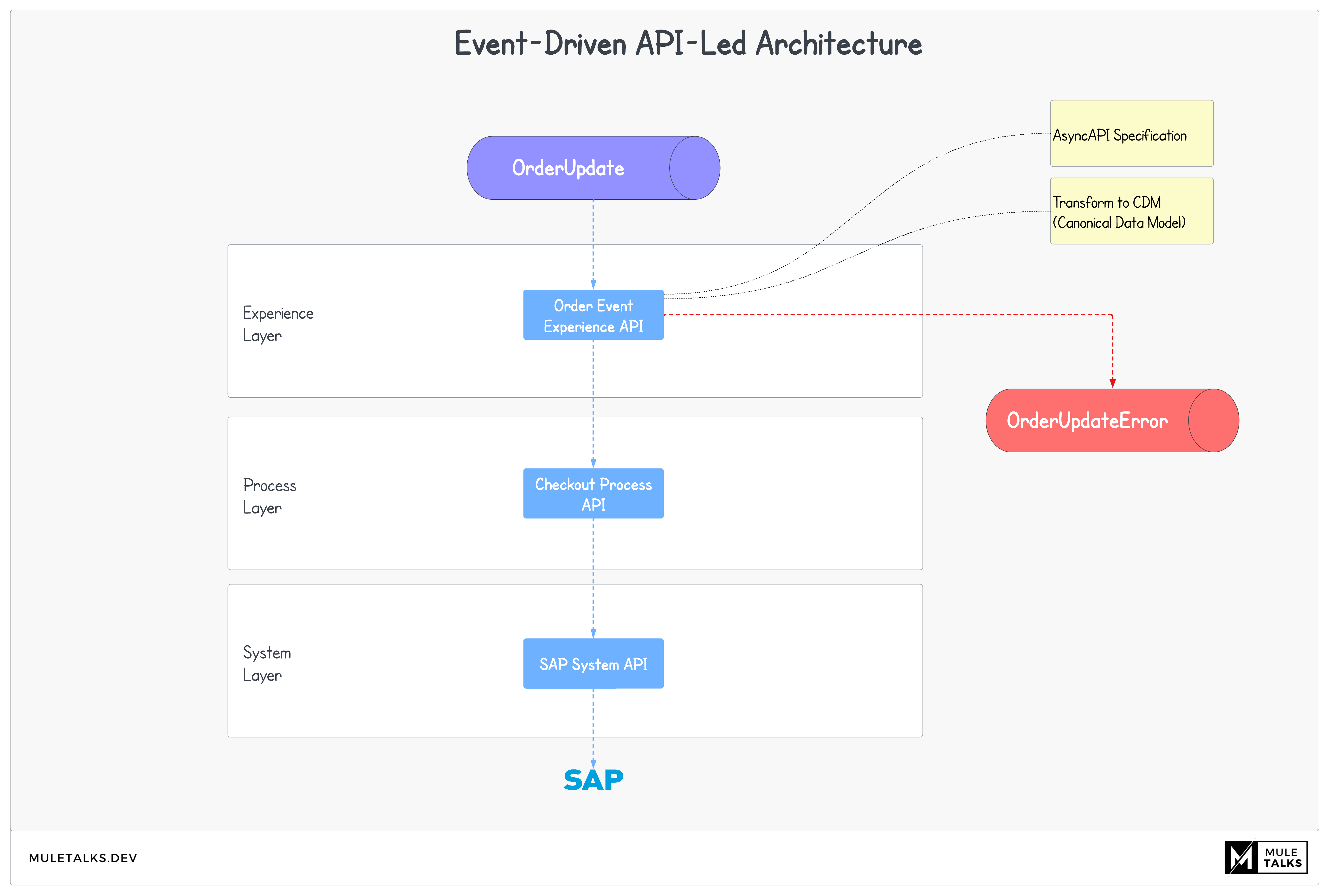In today's digital age, organizations seek real-time updates to stay ahead of the competition and deliver seamless experiences to their users. Traditional synchronous API patterns often fall short in providing real time updates driven by events. Event-Driven Architecture harnesses the power of events, associated states, and timestamps to deliver real-time updates. In this blog post, we will explore the world of Event-Driven Architecture and demonstrate how it integrates with the API-Led design, offering architects and developers a solution for their integration needs.