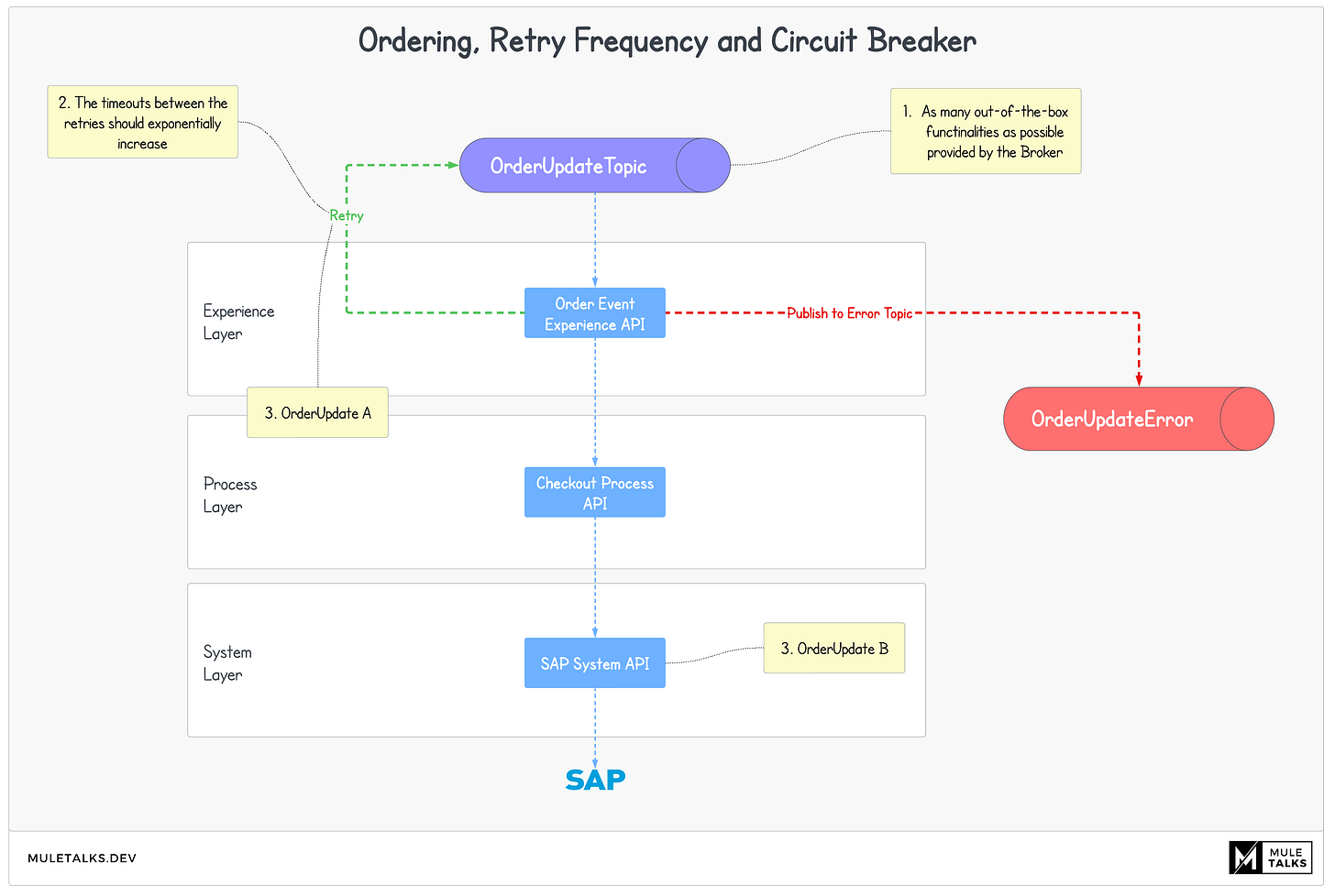 Ordering: We prioritize maintaining the correct order of events, ensuring that a stuck order in the retry mechanism does not overwrite a new order. In the example shown below the OrderUpdate A is stuck in the retry mechanism, where as the OrderUpdate B is already successfully sent to SAP. In this case we want to avoid that the OrderUpdate A will overwrite the Update of B.
