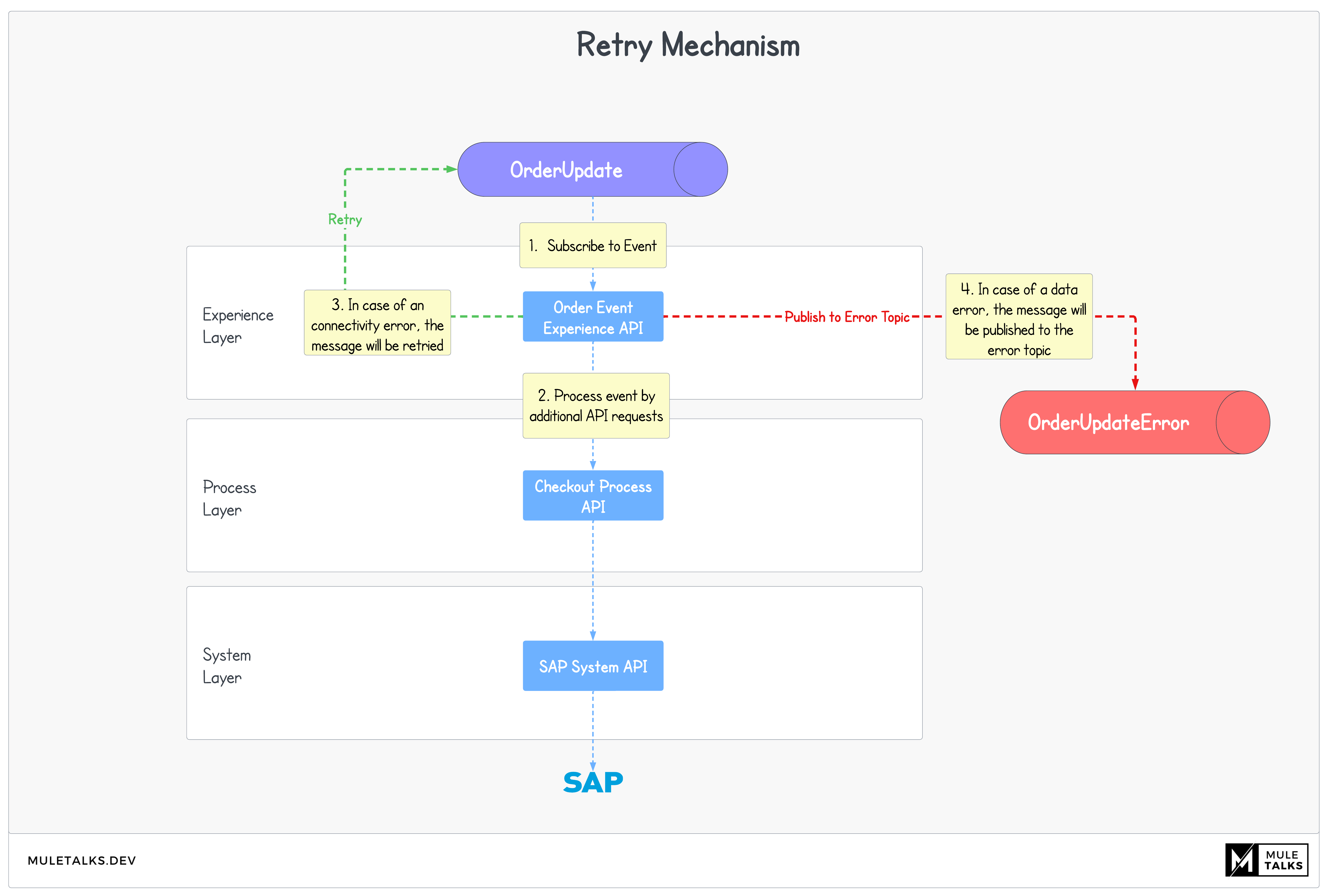 Connectivity Error: In case of a connectivity error, the message should be retried within the same Topic / Queue.